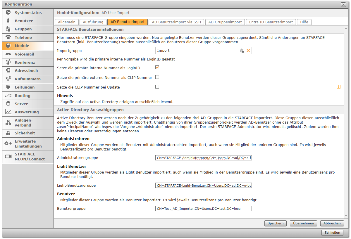 Das Modul “AD User Importer” ermöglicht die einfache Übertragung von Benutzern aus dem lokalen Active Directory oder Entra ID in die STARFACE. Dabei werden Benutzerdaten wie Telefonnummern, Faxnummern und E-Mail-Adressen automatisch übernommen. Bestehende Benutzer werden durch regelmäßige Synchronisation aktualisiert. Zudem erleichtert das Modul den Userimport bei Neuinstallationen.